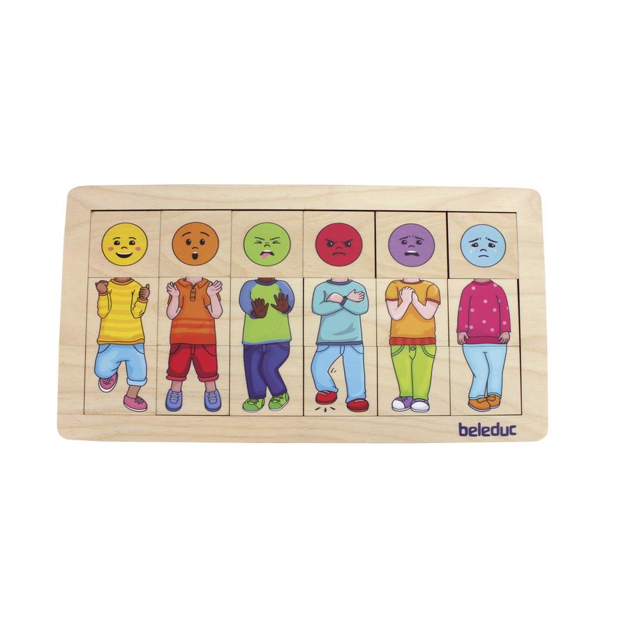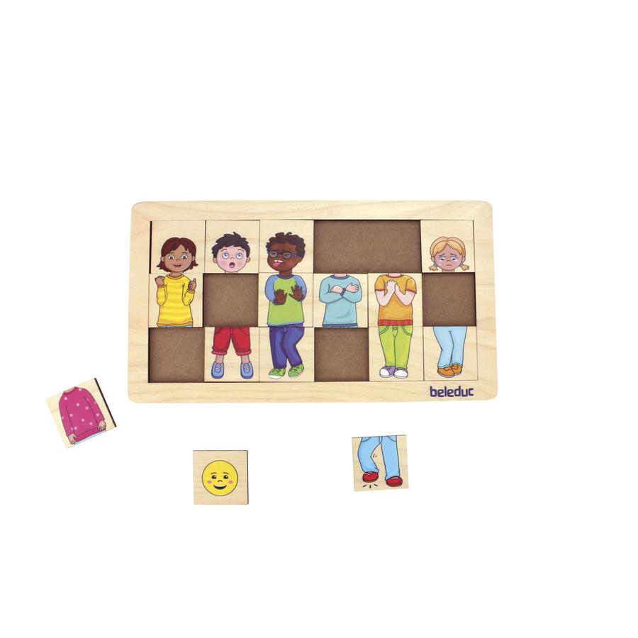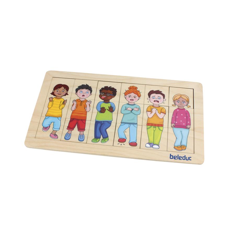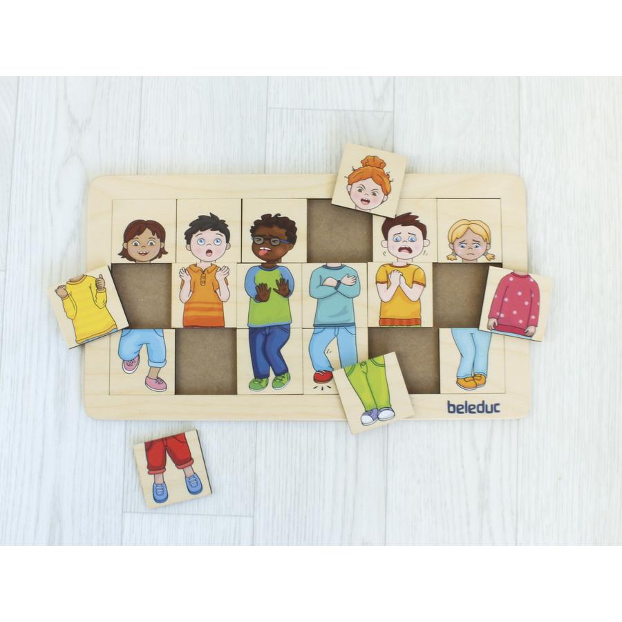Sind diese Menschen traurig, überrascht, wütend, ängstlich oder empfinden sie Ekel? Mit dem Match & Mix-Puzzle lernen Kinder Emotionen spielerisch und ganz intuitiv kennen. Hier heißt es genau hinschauen und entdecken, welche Gesten und Mienenspiele den Ausdruck verstärken und welche weniger gut passen. Auf der Rückseite helfen passende Emotions-Smileys zusätzlich bei der Zuordnung. Das Puzzle lädt zum Gespräch über Emotionen ein, fördert Empathie, Wahrnehmung, Feinmotorik und erweitert den Wortschatz.